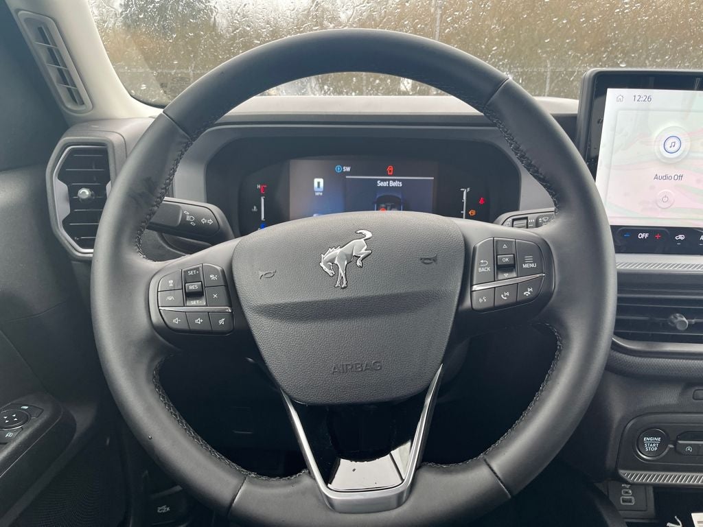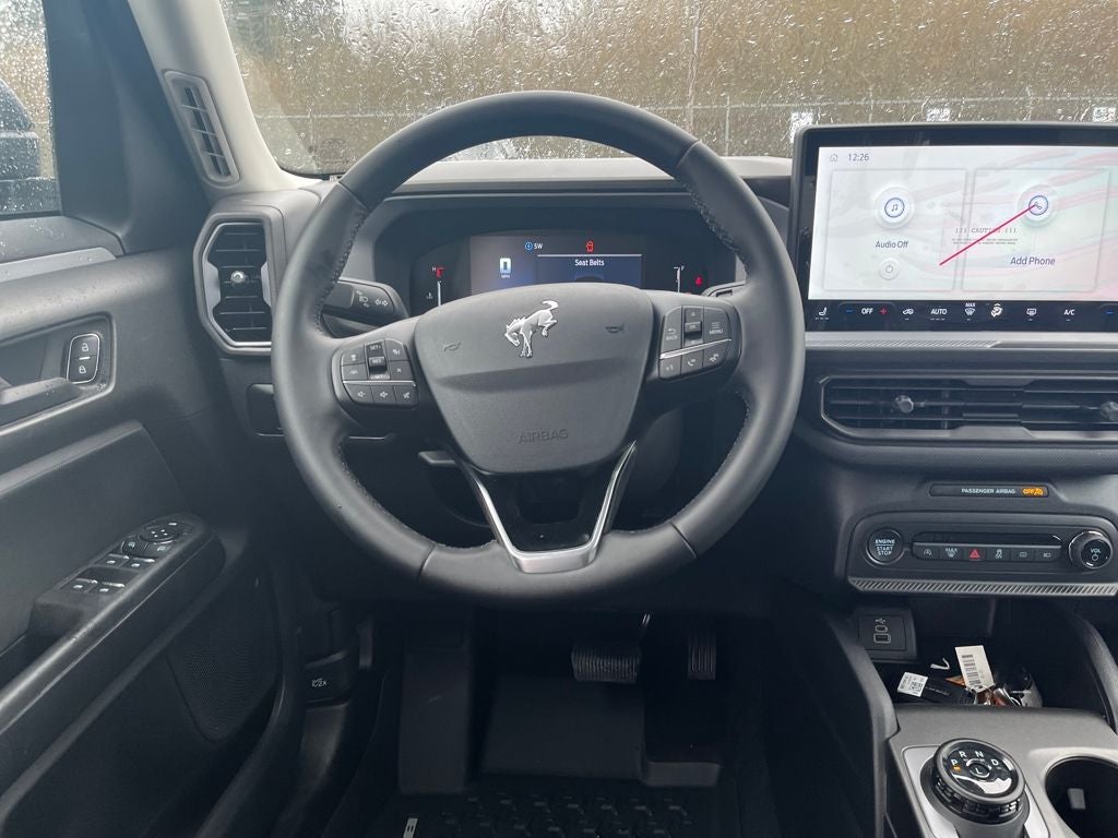This 2026 Ford Bronco Sport comes equipped with, 4-Wheel Disc Brakes, 6 Speakers, ABS brakes, Air Conditioning, Alloy wheels, AM/FM radio: SiriusXM with 360L, AM/FM Stereo, Apple CarPlay/Android Auto, Auto High-beam Headlights, Automatic temperature control, Brake assist, Cloth with Easy-to-Clean Front Bucket Seats, Compass, Delay-off headlights, Driver door bin, Driver vanity mirror, Dual front impact airbags, Dual front side impact airbags, Electronic Stability Control, Emergency communication system: SYNC 4 911 Assist, Exterior Parking Camera Rear, Ford Connectivity Package (1-Year Included), Four wheel independent suspension, Front anti-roll bar, Front Bucket Seats, Front Center Armrest, Front reading lights, Fully automatic headlights, Heated door mirrors, Illuminated entry, Internet access capable: 5G Modem - Ford Connectivity Package, Knee airbag, Low tire pressure warning, Occupant sensing airbag, Outside temperature display, Overhead airbag, Overhead console, Panic alarm, Passenger door bin, Passenger vanity mirror, Power door mirrors, Power steering, Power windows, Radio data system, Rear anti-roll bar, Rear Parking Sensors, Rear reading lights, Rear seat center armrest, Rear window defroster, Rear window wiper, Remote keyless entry, Security system, SiriusXM with 360L, Speed control, Speed-sensing steering, Speed-Sensitive Wipers, Split folding rear seat, Steering wheel mounted audio controls, SYNC 4 with Enhanced Voice Recognition, Tachometer, Telescoping steering wheel, Tilt steering wheel, Traction control, Trip computer, Variably intermittent wipers, Wheels: 17 Carbonized Gray Painted Aluminum. 2026 Ford Bronco Sport Big Bend 4WD 8-Speed Automatic 1.5L EcoBoost