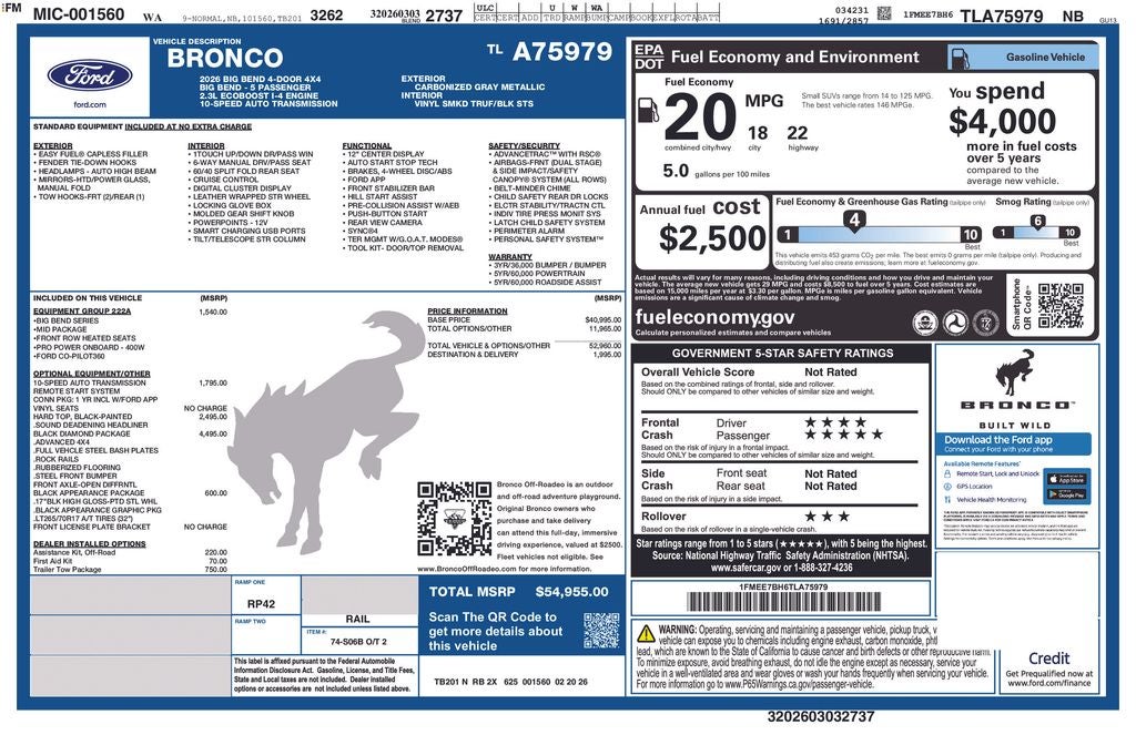 This 2026 Ford Bronco comes equipped with, 2-Door Intelligent Access with Lock/Unlock, 4.46 Final Drive Ratio with Rear Locking Differential, AM/FM Stereo, Ambient Footwell Lighting, Auxiliary Switches, Black Appearance Package, Black Diamond Package, Black Molded-in-Color Door Handles, Black Molded-in-Color Fender Flares, Black Molded-in-Color Sideview Mirror Caps, Black-Painted Molded-in-Color Grille, Cloth Bucket Seats, Connected Navigation, Driver and Front Passenger Illuminated Sliding Visor Vanity Mirrors, Dual Smart Charging USB Ports, Dual-Zone Electronic Automatic Temperature Control, Equipment Group 222A Mid Package, Ford Connectivity Package (1-Year Included), Front Row Heated Seats, LED Fog Lamps, Powder Coated Steel Front and Rear Bumpers, Pro Power Onboard - 400W, Rear Parking Sensors, Rock Rails, SiriusXM with 360L, SYNC 4, Washout Capable Rubberized Flooring, Wheels: 17 Black High Gloss-Painted Steel, Wheels: 17 Carbonized Gray-Painted Aluminum, 4-Wheel Disc Brakes, 7 Speakers, ABS brakes, Air Conditioning, Alloy wheels, AM/FM radio: SiriusXM with 360L, Auto High-beam Headlights, Brake assist, Compass, Delay-off headlights, Driver door bin, Driver vanity mirror, Dual front impact airbags, Dual front side impact airbags, Electronic Stability Control, Emergency communication system: 911 Assist, Exterior Parking Camera Rear, Front anti-roll bar, Front Bucket Seats, Front Center Armrest, Front reading lights, Front wheel independent suspension, Fully automatic headlights, Heated door mirrors, Illuminated entry, Integrated roll-over protection, Low tire pressure warning, Occupant sensing airbag, Outside temperature display, Overhead airbag, Overhead console, Panic alarm, Passenger door bin, Passenger vanity mirror, Power door mirrors, Power steering, Power windows, Radio data system, Remote keyless entry, Security system, Speed control, Split folding rear seat, Steering wheel mounted audio controls, Tachometer, Telescoping steering wheel, Tilt steering wheel, Traction control, Trip computer, Variably intermittent wipers, 2-Door Intelligent Access with Lock/Unlock, 4.46 Final Drive Ratio with Rear Locking Differential, AM/FM Stereo, Ambient Footwell Lighting, Auxiliary Switches, Black Appearance Package, Black Diamond Package, Black Molded-in-Color Door Handles, Black Molded-in-Color Fender Flares, Black Molded-in-Color Sideview Mirror Caps, Black-Painted Molded-in-Color Grille, Cloth Bucket Seats, Connected Navigation, Driver and Front Passenger Illuminated Sliding Visor Vanity Mirrors, Dual Smart Charging USB Ports, Dual-Zone Electronic Automatic Temperature Control, Equipment Group 222A Mid Package, Ford Connectivity Package (1-Year Included), Front Row Heated Seats, LED Fog Lamps, Powder Coated Steel Front and Rear Bumpers, Pro Power Onboard - 400W, Rear Parking Sensors, Rock Rails, SiriusXM with 360L, SYNC 4, Washout Capable Rubberized Flooring, Wheels: 17 Black High Gloss-Painted Steel, Wheels: 17 Carbonized Gray-Painted Aluminum. Carbonized Gray Metallic 2026 Ford Bronco Big Bend 4WD 10-Speed Automatic 2.3L EcoBoost I-4