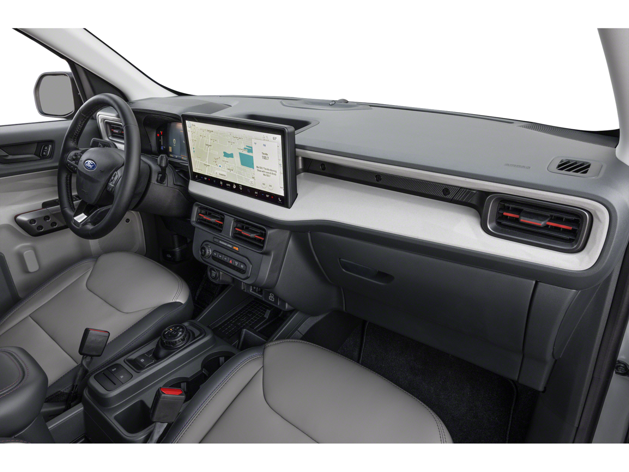 This 2026 Ford Maverick comes equipped with, 2.5L I-4 Hybrid, 2.91 Axle Ratio, 4-Wheel Disc Brakes, 8 Speakers, ABS brakes, ActiveX Trimmed Heated Front Bucket Seats, Air Conditioning, Alloy wheels, AM/FM radio: SiriusXM with 360L, Apple CarPlay/Android Auto, Auto High-beam Headlights, Automatic temperature control, Brake assist, Bumpers: body-color, Compass, Delay-off headlights, Driver door bin, Driver vanity mirror, Dual front impact airbags, Dual front side impact airbags, Electronic Stability Control, Emergency communication system: SYNC 4 911 Assist, Exterior Parking Camera Rear, Ford Connectivity Package (1-Year Included), Four wheel independent suspension, Front anti-roll bar, Front Bucket Seats, Front Center Armrest, Front dual zone A/C, Front reading lights, Fully automatic headlights, Heated door mirrors, Heated front seats, Heated steering wheel, Illuminated entry, Internet access capable: 5G Modem - Ford Connectivity Package, Knee airbag, Low tire pressure warning, Navigation system: Connected Navigation, Occupant sensing airbag, Outside temperature display, Overhead airbag, Overhead console, Panic alarm, Passenger door bin, Passenger vanity mirror, Power door mirrors, Power driver seat, Power steering, Power windows, Radio data system, Radio: B&O Sound System by Bang and Olufsen, Rear anti-roll bar, Rear seat center armrest, Rear step bumper, Remote keyless entry, Security system, SiriusXM with 360L, Speed control, Speed-sensing steering, Steering wheel mounted audio controls, SYNC 4 with Enhanced Voice Recognition, Telescoping steering wheel, Tilt steering wheel, Traction control, Trip computer, Wheels: 19 Machined Aluminum Painted, 2.5L I-4 Hybrid. 2026 Ford Maverick Lariat AWD CVT 2.5L I-4 Hybrid