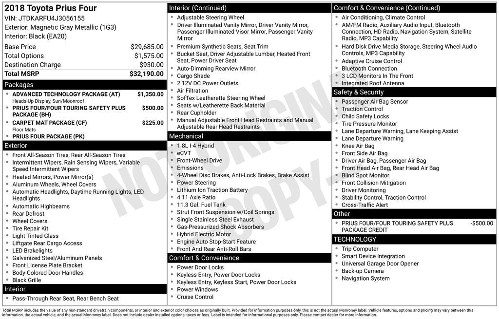 I-5 Cars has been Family Owned & Operated since 2001, providing our community with quality pre-owned vehicles and exceptional customer service.This 2018 Toyota Prius Four is a standout in the compact hybrid segment, offering a winning combination of efficiency, technology, and comfort. Highlighted by - Leather, Local Trade In, Advanced Technology Package, Prius Four/Four Touring Safety Plus Package, and Carpet Mat Package.The Prius Four delivers an exceptional fuel economy of 54 city/50 highway MPG, thanks to its 1.8L 4-cylinder DOHC 16V VVT-i engine and CVT transmission. Slip behind the wheel and enjoy the responsive handling and smooth, quiet ride that make the Prius a joy to drive, whether commuting or embarking on a road trip.The cabin is appointed with premium SofTex-trimmed heated front seats, a power-sliding moonroof, and a color head-up display that projects vital information directly into your line of sight. Stay connected with the Entune Premium Audio system featuring navigation, app suite, and 6 speakers.Safety is a top priority, with advanced features like Intelligent Clearance Sonar, Lane Change Assist, and a Rear Camera. You'll also benefit from Toyota's renowned reliability and peace of mind.This Prius Four represents an exceptional value in the pre-owned hybrid market. With low mileage and a well-equipped, meticulously maintained interior, it's ready to provide years of efficient, comfortable, and technologically-advanced transportation.We invite you to experience the Toyota Prius Four for yourself. Schedule a test drive today and discover why this hybrid hatchback is a smart choice for your next vehicle.