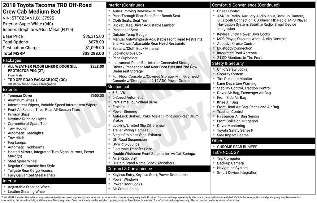 I-5 Cars has been Family Owned & Operated since 2001, providing our community with quality pre-owned vehicles and exceptional customer service.This 2018 Toyota Tacoma TRD Off-Road V6 is a true off-road champion, ready to take on any adventure. Boasting a powerful 3.5L V6 engine with 278 horsepower, this Tacoma is equipped with a 6-speed automatic transmission and 4-wheel drive, ensuring exceptional performance both on and off the beaten path.- Custom Wheels and Tires- Lift Kit- Tow Package- Hard Tri-Fold Tonneau Cover- All Weather Floor Liner & Door Sill Protector PackageWith its rugged good looks and impressive capability, this Tacoma is the perfect companion for the outdoor enthusiast. The TRD Off-Road package adds a host of off-road-focused features, including an electronic locking rear differential, Bilstein shocks, and skid plates, making it a true workhorse that can tackle the toughest terrain.Inside, the Tacoma offers a comfortable and well-equipped cabin, with features like air conditioning, remote keyless entry, traction control, ABS brakes, and electronic stability control. The Entune Premium audio system with navigation and app suite keeps you connected and entertained on the go.Safety is also a top priority, with features like dual front and side impact airbags, engine immobilizer, and an available rearview camera to help you navigate with confidence.Whether you're hauling gear for your next camping trip or tackling a challenging off-road trail, this 2018 Toyota Tacoma TRD Off-Road V6 is the perfect companion. With its impressive capabilities, rugged good looks, and exceptional features, this Tacoma is sure to exceed your expectations.I-5 Cars is proud to offer this well-equipped and meticulously maintained Tacoma to our valued customers. Come in and experience the power and versatility of this impressive off-road-ready truck for yourself. We're confident you'll be impressed by its capabilities and won't want to leave without taking it home.