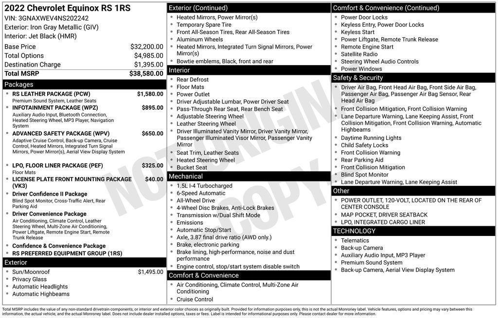 Powered by a 1.5L DOHC engine and equipped with All-Wheel Drive, this Equinox RS delivers an exceptional driving experience. With an EPA-estimated 25 MPG in the city and 30 MPG on the highway, it strikes the perfect balance between power and efficiency.