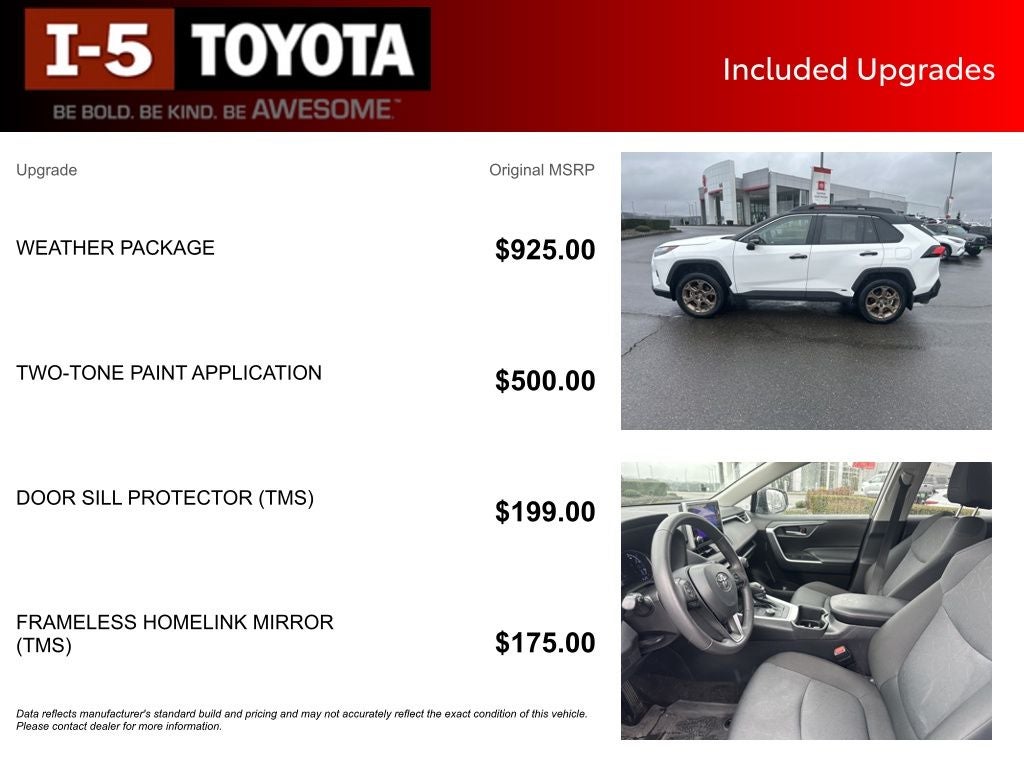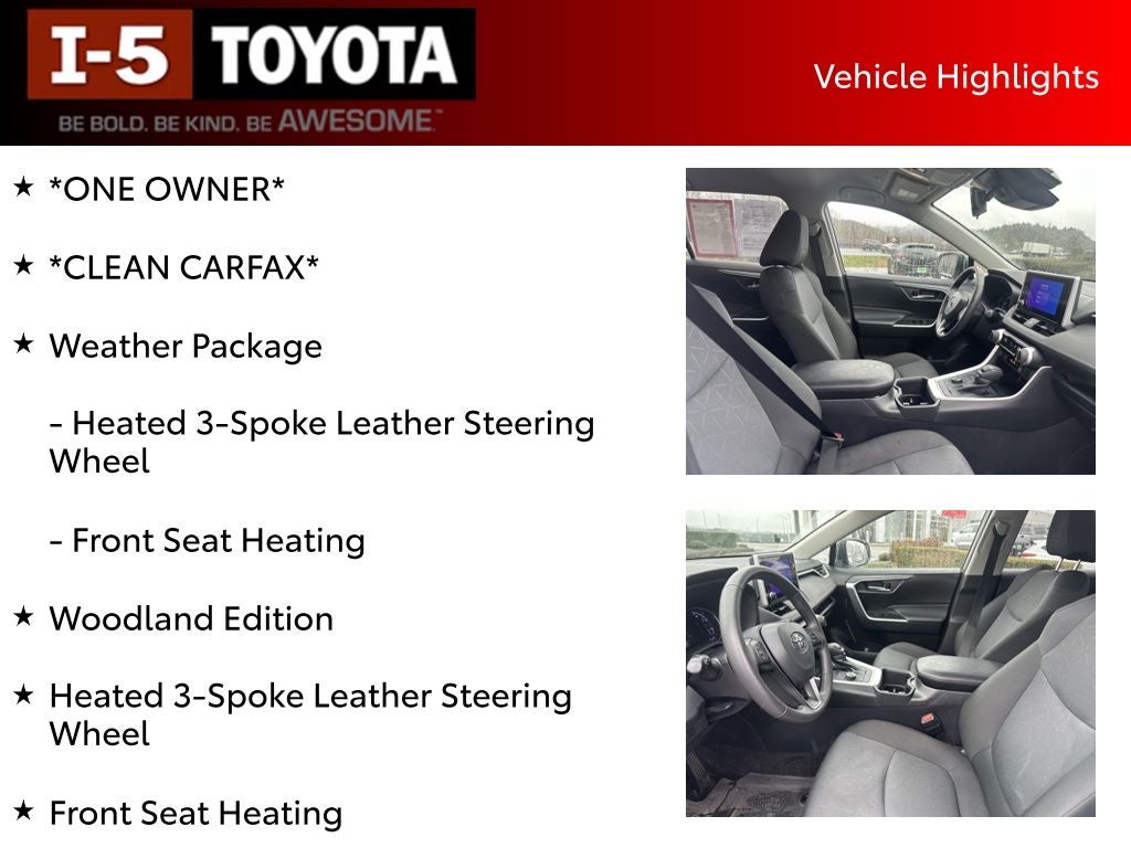 I-5 Cars has been Family Owned & Operated since 2001, providing our community with quality pre-owned vehicles and exceptional customer service.This stunning 2025 Toyota RAV4 Hybrid Woodland Edition is a true standout in our inventory. Boasting a clean CARFAX and single-owner history, this well-maintained SUV is ready to take you on your next adventure. Let's explore the features that make this RAV4 Hybrid Woodland Edition a must-have.- One Owner- Clean CARFAX- Weather Package (Heated Steering Wheel, Front Seat Heating)- Two-Tone Paint Application (Roof and Pillar Stripe)- Door Sill Protectors- Frameless HomeLink MirrorThe Woodland Edition of the RAV4 Hybrid adds a touch of rugged sophistication to this versatile SUV. With its all-wheel drive capabilities and impressive fuel efficiency, you'll enjoy a seamless blend of capability and eco-consciousness. The 2.5L 4-cylinder hybrid powertrain delivers an exceptional 38 MPG in the city and 35 MPG on the highway, making it an ideal choice for your daily commute and weekend getaways.Slip into the driver's seat and experience the comfort and convenience of the RAV4 Hybrid Woodland Edition. The heated steering wheel and front seats will keep you cozy on chilly mornings, while the two-tone paint application and door sill protectors add a unique and stylish flair. The frameless HomeLink mirror provides a sleek, integrated look, elevating the overall interior design.Beyond the premium features, this RAV4 Hybrid Woodland Edition is packed with a wealth of advanced technologies and safety systems. Enjoy the convenience of the rearview camera, automatic climate control, and keyless entry, all while knowing you're protected by the comprehensive suite of airbags and electronic stability control.Whether you're embarking on outdoor adventures or navigating the daily commute, this 2025 Toyota RAV4 Hybrid Woodland Edition is the perfect companion. Its exceptional fuel efficiency, versatile capabilities, and premium amenities make it a standout choice in the competitive SUV market.I encourage you to schedule a test drive and experience the exceptional quality and value of this remarkable vehicle. At I-5 Cars, we are committed to providing our customers with the best possible purchasing experience. Let us demonstrate how this 2025 Toyota RAV4 Hybrid Woodland Edition can elevate your driving experience.